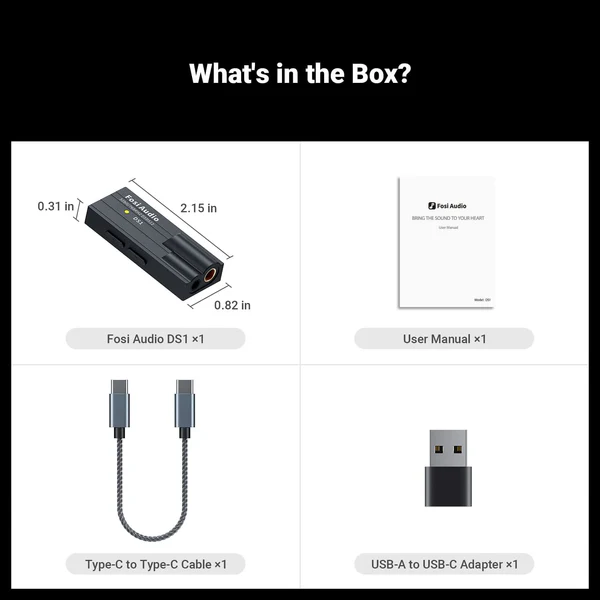 As saídas duplas para fones de ouvido de 3,5 mm e 4,4 mm são potentes o suficiente para alimentar facilmente a maioria dos fones de ouvido. A saída tradicional de 3,5 mm (single-ended) é amplamente compatível com a maioria dos fones, enquanto a saída balanceada de 4,4 mm proporciona uma experiência de áudio mais detalhada. Especificações: THD+N < 0,0006%, potência de saída de até 220 mW, SNR > 120 dB, ruído < 1,6 µA.Conteúdo da embalagem: 1 DAC USB para fones de ouvido DS1, 1 cabo USB-C para USB-C, 1 conversor USB-A para USB-C, 1 manual do usuário, nossa garantia de 24 meses sem preocupações e atendimento ao cliente amigável. NOTA: A nova versão do amplificador de fones de ouvido DS1 otimizou o controle de volume, que agora é controlado independentemente do dispositivo de origem do áudio.