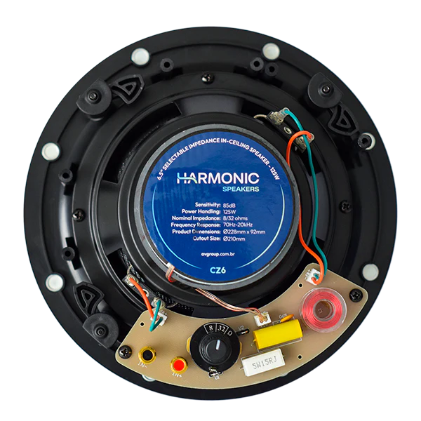 O alto-falante de embutir Harmonic CZ6, possui 125W de potência e um exclusivo seletor de impedância para 8 ou 32 Ohms, fazendo com que as caixas alterem sua impedância nominal conforme a necessidade do projeto ou instalação.