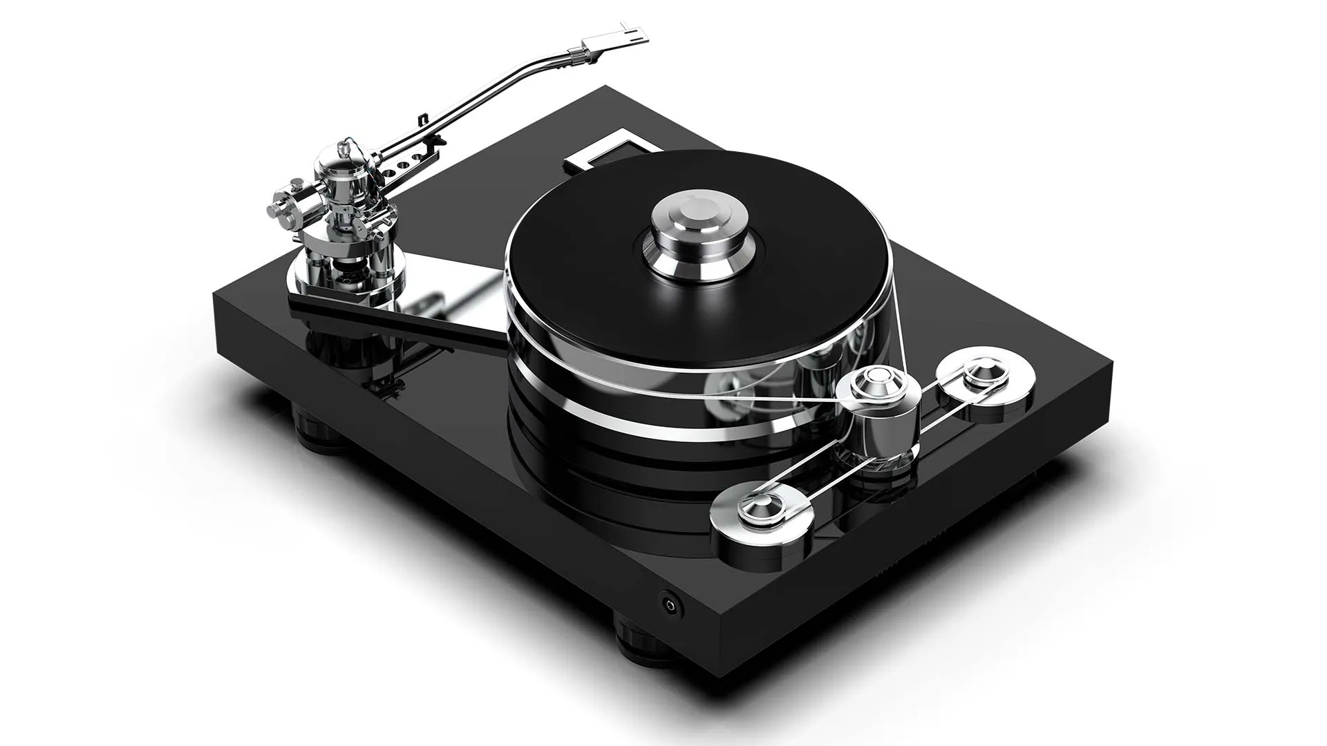 O pedestal principal suporta um sistema de volante de inércia com dois motores, acionado por correia, que é desacoplado, mas aciona o prato de alta massa amortecido em TPE. O pedestal principal também abriga a tela sensível ao toque que permite o controle de todos os parâmetros operacionais e o ajuste ultrapreciso da velocidade. O subchassi é feito de alumínio usinado e fica abaixo do prato. Ele é responsável por suportar a suspensão magnética do prato. Almofadas de TPE isolam todo o conjunto e reduzem ainda mais a perturbação e a vibração indesejadas. O sistema de acionamento por correia do volante emprega dois motores e garante uma operação mecânica sem vibração e ruído para todas as partes móveis. O braço avançado de 12″ com pivô único pode acomodar praticamente qualquer cápsula devido à sua ampla gama de capacidades de ajuste e uma variedade de contrapesos (incluídos). O ajuste VTA é rápido e pode ser feito enquanto você ouve!